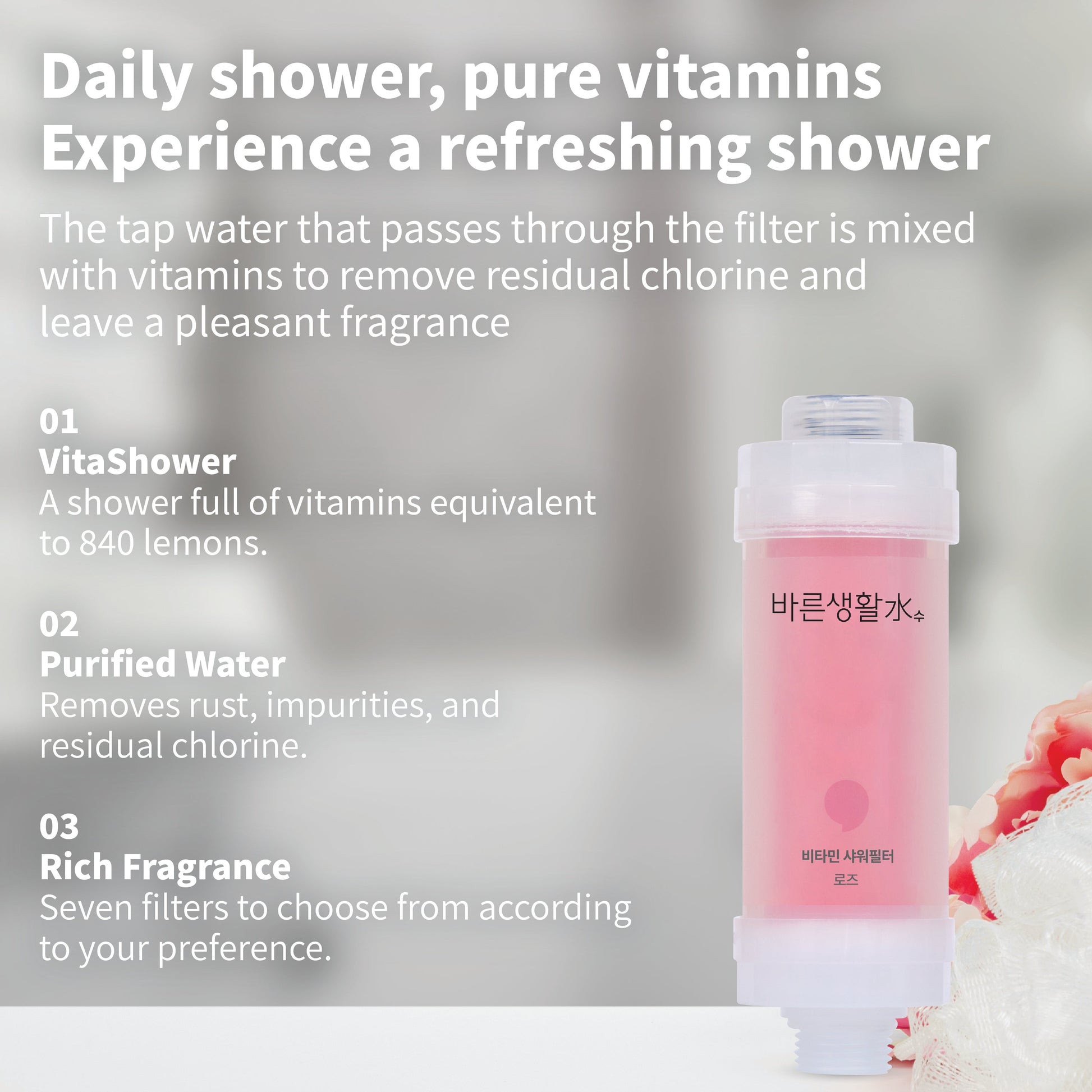 Tap water flows through the filter, mixes with vitamins, removes residual chlorine, and delivers a pleasant fragrance.