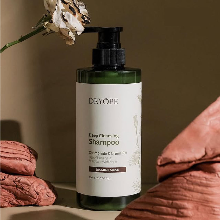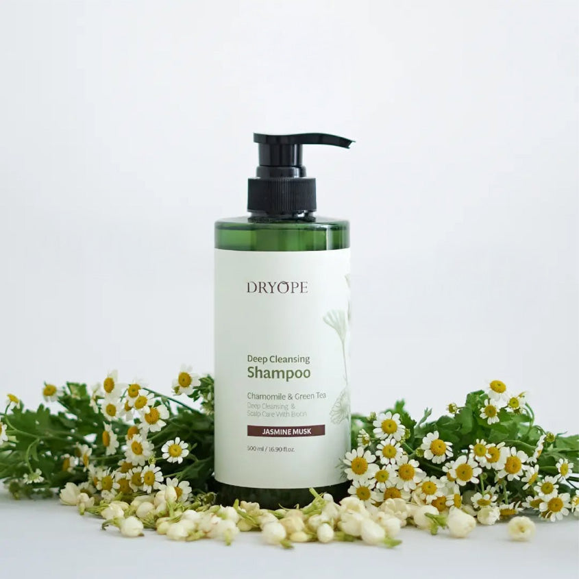 The DRYOPE Deep Cleansing Shampoo Jasmine Musk is designed to provide a thorough cleanse while offering soothing care for the scalp.